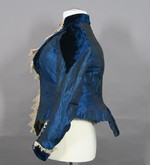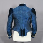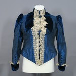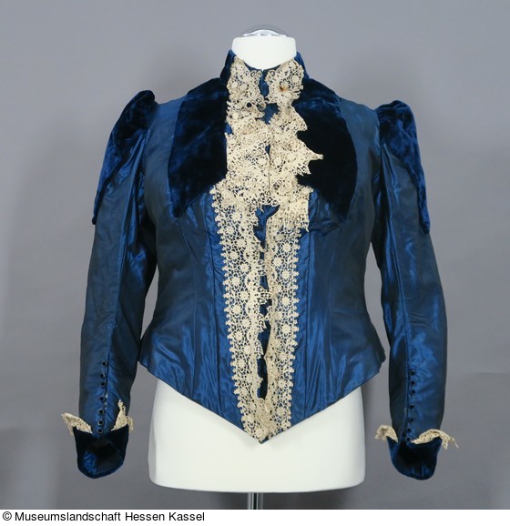 Damenjacke aus schwarzblauer Taftseide mit Besätzen aus dunkelblauem Samt und weißer Spitze.