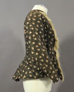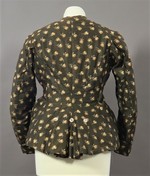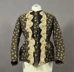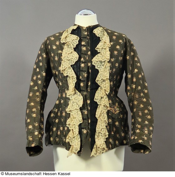 Der Verschluss besteht aus 11 Knopflöchern, die zugehörigen Knöpfe sind nicht mehr vorhanden. Wahrscheinlich waren sie gleich oder ähnlich gestaltet wie die 3 Perlmuttknöpfe, die im Rücken auf dem Schoß aufgenäht sind. Neben der Knopfleiste sind die Vorderteile mit einem in schmale Längsfalten gelegten Besatz aus schwarzem Stoff und einer als Wasserfall arrangierten hellen Tüllspitze garniert. Auf der linken Seite ist auf Hüfthöhe eine kleine Uhrentasche aus dem Jackenstoff aufgesetzt.