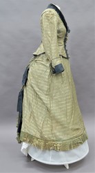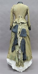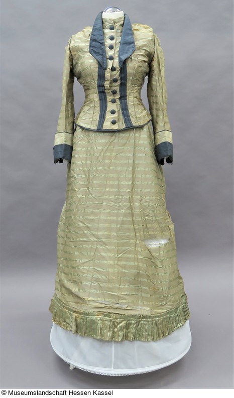 Jacke und Schürzenüberrock sind aus einer in Grau und eisblau gestreiften Halbseide hergestellt, die Jacke ist außerdem mit dunkelblauem Seidenrips garniert.