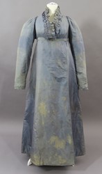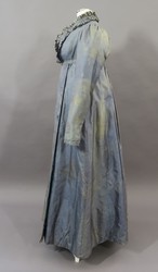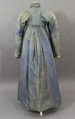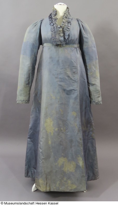 Das Oberteil ist auf Figur gearbeitet und endet kurz unter der Brust. Der Rock ist glatt angesetzt, durch die keilförmigen Seitenteile und das in der hinteren Mitte stark angekrauste Rückenteil ist er leicht ausgestellt.