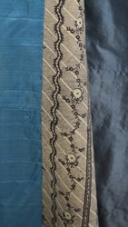 Das gesamte Kleid ist mit Baumwollvlies wattiert und innen mit einem braunweißen Druckstoff mit Streifendekor gefüttert. Im Oberteil und an den Vorderkanten besteht das Futter aus blauer Seide, in der Schulterpartie sind Vlies und Futter zusätzlich gesteppt.