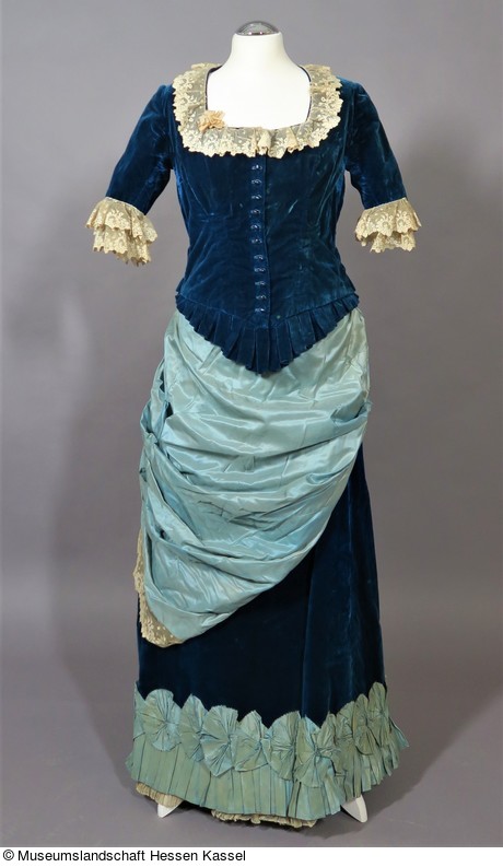 Das Gesellschaftskleid aus preußischblauem Samt ist mit hellblauem Taft und Spitzen garniert.