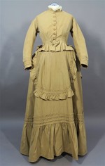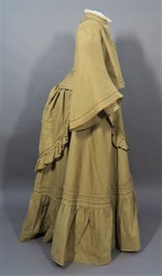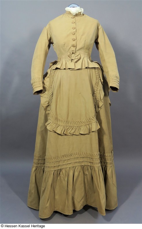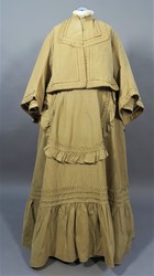 Dieses vierteilige Reisekleid besteht aus einem Rock, einem hochgeschlossenen, langärmeligen Oberteil, einem doppelten Schoßteil und einer weiten Überjacke.