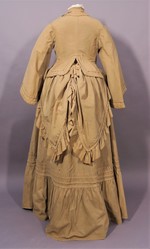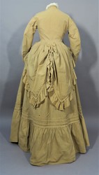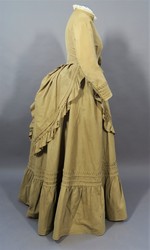 Diese Form der Rockdekoration entstand Anfang der 1860er Jahre als man begann einen kompletten Überrock in verschiedenen Partien über dem Grundrock aufzuraffen. Dieser Überrock wurde im Laufe der Zeit immer mehr verkürzt bis nur noch eine Art Schürze und schließlich nur einzelne Schoßteile wie bei diesem Ensemble übrig waren.