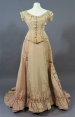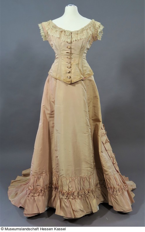Das Ballkleid besteht aus Mieder und Tournürenrock mit Schleppe.