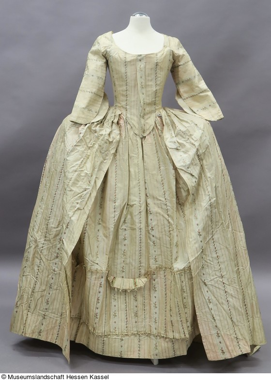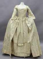 Diese Robe à l’anglaise aus dem letzten Viertel des 18. Jahrhunderts besteht aus rosa und weiß gestreiftem Seidentaft mit weißen Längsstreifen, die mit Blütenzweigen und Ranken dekoriert sind.
