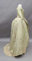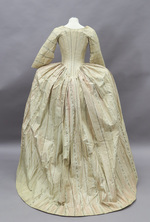 Das Kleid wird über einem ovalen Reifrock getragen, der Rock ist am Saum mit einem breiten Volant besetzt, während der Rock des Überkleides unverziert ist. Das Mieder hat einen runden Ausschnitt und läuft vorne und hinten in einer Spitze aus. Der Rock ist in sehr schmalen Falten dort angesetzt und die halblangen Ärmel enden in gebogenen Kanten.
