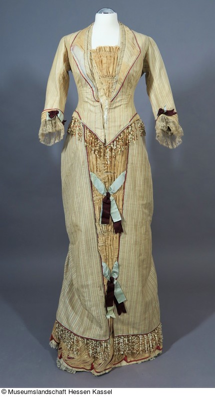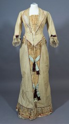Das Kleid ist über einen längeren Zeitraum zu starkem Lichteinfall ausgesetzt gewesen, deswegen sind von dem hellgelben Baumwollsatin nur noch die beigen Schussfäden aus Baumwolle vorhanden.