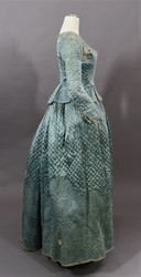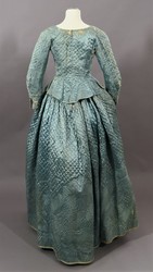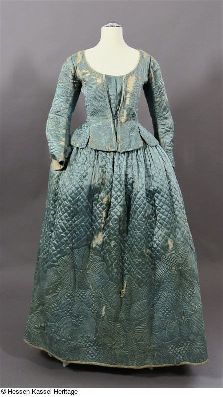 Das Grundmuster ist ein Rautennetz, das auch heute noch für solche Steppereien verwendet wird. Daneben ist der Saum des weiten, in der Taille angekrausten Rockes mit einer breiten floralen Bordüre verziert. Eine kleine Variante des Dekors wurde auch auf dem langärmeligen Mieder verwendet, das über einem gleichfarbigen Stecker geschnürt wurde. Es ist in der in dieser Zeit üblichen Form mit Fischbein versteift und mit Baumwollflanell gefüttert. Der angeschnittene Schoß ist so geteilt, dass er glatt über den ausgestellten Rock fällt.