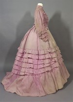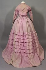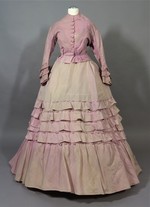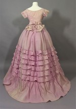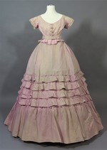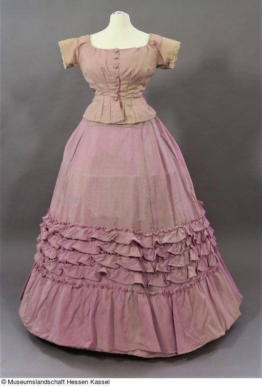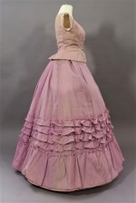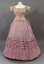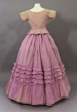Die zwei sehr ähnlichen Kleider aus rosa Wollstoff werden über einer Krinoline getragen, beide haben auf Figur gearbeitete Mieder mit kurzen Ärmen. Das 2. Kleid ist etwas kleiner als das erste.