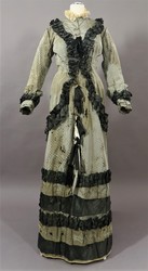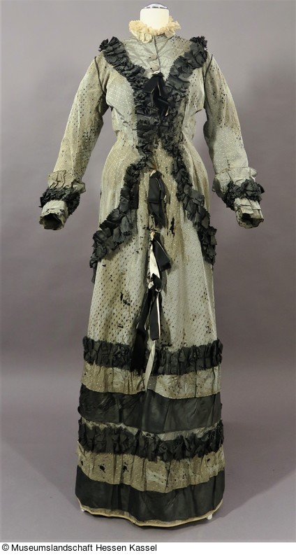 Der Stehkragen ist mit einer Rüsche aus weißer Tüllspitze eingefasst, die übrige Garnitur besteht aus sehr fein schwarz-weiß getreiftem Seidentaft sowie schwarzen und weißen Atlasbändern: