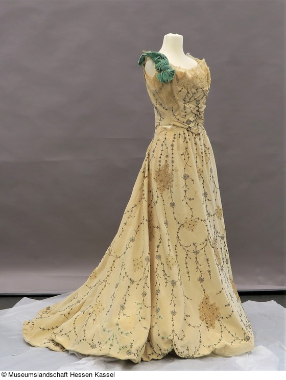 Zu dem glockig geschnittenen Rock, der hinten in einer Schleppe ausläuft, gehört ein taillenkurzes Oberteil mit sehr breitem Ausschnitt, dass vorne locker geschnitten und in Falten drapiert ist. Es endet vorne in einer kurzen Schneppe und läuft im Rücken in einer längeren Schnürleiste aus. Erhalten sind schmale Träger, die vermutlich auf dem äußersten Rand der Schultern saßen, Kantenversäuberungen oderÄrmelansätze fehlen. Es sind aber Reste von gerafftem Seidentüll erhalten, die wahrscheinlich von halblangen Ärmeln stammen. In wie weit diese mit Stoff unterlegt waren, ist nicht mehr festzustellen.