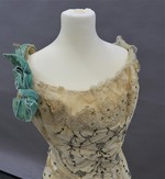 Auch die Ausschnittkante scheint vorne und hinten mit diesem Tüll garniert gewesen zu sein. Auf der rechten Schulter ist ein blaugrünes Samtband erhalten, das vorne in einer großen Schleife endet.