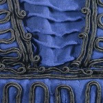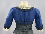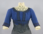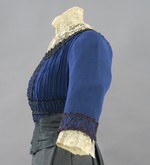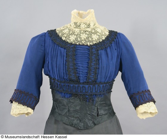 Oberteil eines Damenkleides mit kurzen Ärmeln aus dunkelblauem, gitterartig gewebtem Stoff, dekoriert mit Quer- und Längsfalten sowie Wellenbändern aus schwarzer Seidentresse an Halsausschnitt, Ärmelkanten, Brustband und Vorderteil. Das Kleid ist im Rücken mit Druckknöpfen und Haken zu schließen.