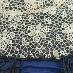 In dem großen, runden Ausschnitt des blau-schwarzen Kleides liegt ein Einsatz mit Stehkragen aus cremeweißer Spachtelspitze. Der Stehkragen reicht an den Seiten bis an den Unterkiefer, 4 eingenähte Kragenstäbchen verhindern das Zusammenfallen.