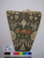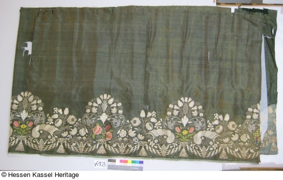 Das erhaltene Fragment eines Kleiderrockes besteht aus grünem Taft und ist am Saum mit einer breiten Bordüre aus Blumensträußen und Füllhörnern bestickt, die auf einer Girlande aus einem mit Quasten gerafften Band stehen. Um zu verhindern, dass die relativ schwere Seiden- und Metallstickerei in der dünnen Seide abreißt, war der Saum vermutlich mit dem leinenen Druckstoff abgefüttert, von dem ebenfalls Fragmente vorhanden sind (KP K 103b). Sein rotschwarzer Blumendekor lässt, ebenso wie die Stickerei des Rocksaumes eine Datierung in die Zeit um 1700 zu.