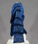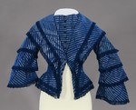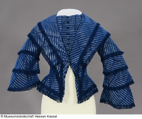 Über die Schultern fallen auf der Vorderseite je 2 abgestufte Kragenvolants, die zu den unteren Kanten hin spitz zulaufen. Die Pagodenärmel bestehen aus vier auf einem dunkelblkauen Leinefutter übereinander gesetzte Volants. Rechts fehlt der unterste. Deren Säume und die der Kragenvolants sind mit dunkelblauen Seidenfransen besetzt. Auch den Jackensaum zieren 2 übereinandergesetzte Reihen dieser Fransen.