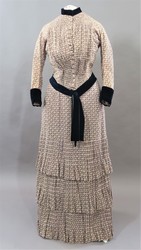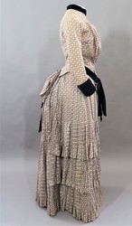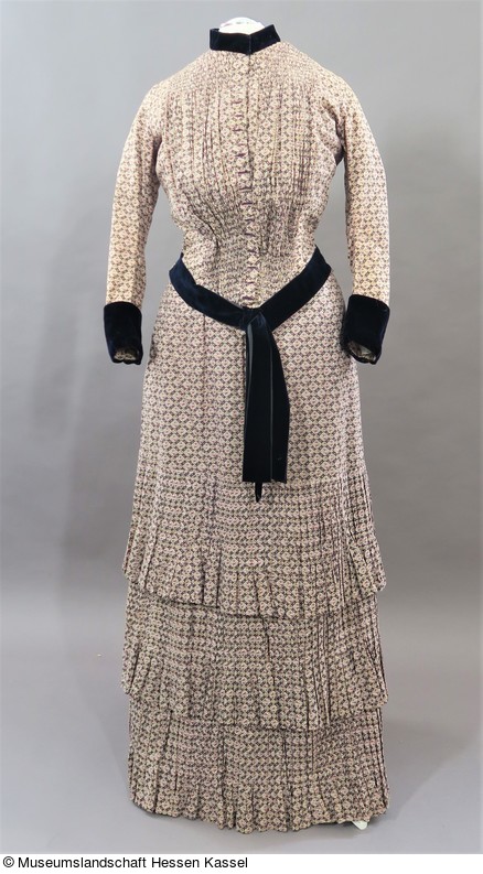 Außerdem ist an der rechten Rockschlitzkante zwischen Bund und Banddurchzug ein weiteres Band angenäht, das mit mit einem Haken und 2 Ösen besetzt ist und mit dem die hintere Rocklänge reguliert werden konnte. Möglicherweise ließ sich so eine - ohnehin nur sehr kurze - Schleppe aufnehmen und stattdessen den Tournürenbausch vergrößern.