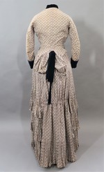 Die Säume der Vorderteile sind mit Samt besetzt, auf der rechten Seite endet der Besatz in einer langen Schleife, die den Verschluss der Jacke verdeckt. Im Rücken sind die geteilten Schöße vermutlich nachträglich diagonal übereinander geheftet und darauf eine große, gebauschte Doppelschlaufe aus dem Kleiderstoff aufgesetzt worden. Deren Mitte ist mit der gleichen, langen Samtschliefe garniert wie die Schneppe.