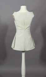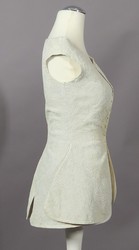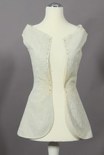 Dieses weiße Exemplar ist komplett mit Piquéestickerei verziert – in der Technik der Schnurstepperei. Die Schnüre sind zwar zwischen 2 Lagen Leinen eingezogen und in Rankenmustern festgesteppt worden, eine Wattierung fehlt jedoch. Stattdessen ist die Weste innen mit feinem Leinenbatist gefüttert. Schnürlöcher an den Vorderkanten zeigen, dass sie über einem Stecker geschnürt wurde.