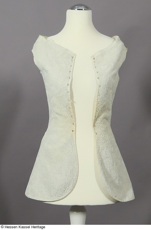Die Schöße sind an Vorder- und Rückenteil ausgestellt und an den Seitennähten geschlitzt, um so zu gewährleisten, dass die Weste glatt über den ausladenden Rock fiel.