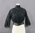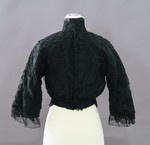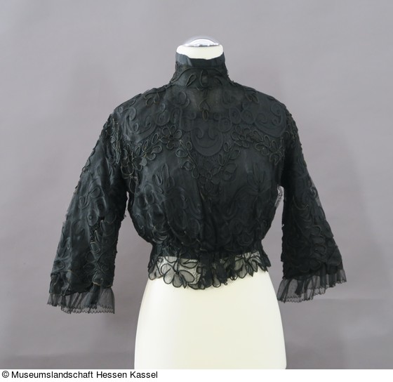 Die Konturen der Maschinenspitze wurden mit schwarzer Kordel und schwarzem Tressenband besetzt. Für die Bluse wurden die Ärmel angeschnitten. Die Spitze ist mit einer schwarzem Taftbluse unterlegt - hier sind die Ärmel separat geschnitten - die wiederum mit schwarzer Baumwolle gefüttert ist. Die Taftbluse hat einen halsfernen, runden Ausschnitt, der, ebenso wie die Ärmelkanten, mit der gleichen gekreppten Seide wie bei KP NT 460 eingefasst ist. An den Kreppblenden der Taftbluse sind Rüschen aus schwarzem Tüll angesetzt, die unter der Spitzenbluse herausreichen. Deren hoher Stehkragen ist mit schwarzem Voile unterlegt.