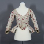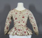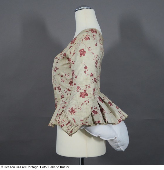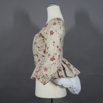 Caraco aus weißem, mit roten Blütenranken bedrucktem Chintz. Die Jacke hat 3/4lange Ärmel und einen tiefen, spitz zulaufenden Ausschnitt und endet vorne in einem runden Bogen. An den Seiten und im Rücken ist ein gerader, in tiefe falten gelegter Schoß angesetzt.