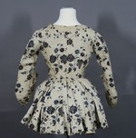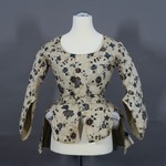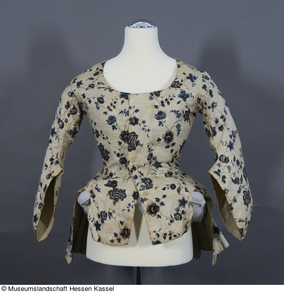Caraco aus einem violettgrundigen, gechinzten Baumwolldruckstoff (Indienne) mit Blumenranken in vorwiegend Rot und Blau.