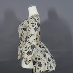 Der Caraco ist auf ein Leinenfutter gearbeitet, in das an den Vorderteilen Schnürleisten eingearbeitet sind. Der rückwärtige Schoß ist mit einem indigoblauen Wollköper gefüttert.