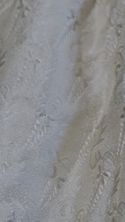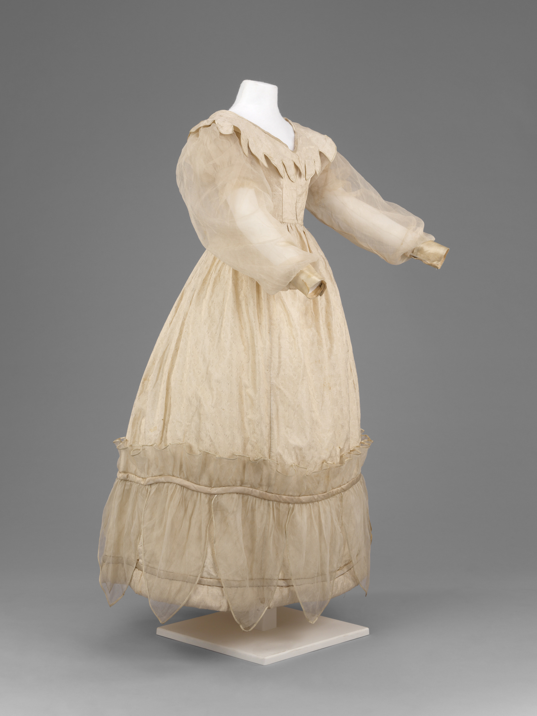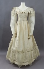 Kleid aus cremefarbener, kleingemusterter Seide, breitem, vorne und hinten spitz zulaufendem Ausschnitt und Hammelkeulenärmeln aus Chiffon.