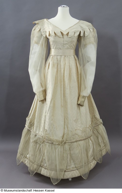 Das Oberteil ist auf Figur gearbeitet und die Taillenlinie sitzt an der natürlichen Stelle. Der breite und tiefe Ausschnitt ist mit einer schmalen Blende aus cremefarbenen Satin eingefasst, die zur Versteifung über eine geflochtene Strohborte genäht wurde. Darunter liegt ein ausgezackter, mit Satin eingefasster Schulterkragen, dessen größte Breite über den Armkugeln liegt.Die Ärmel aus Kleiderstoff sind kurz, gepufft und enden in einem mit Tüllspitze besetzten Bündchen. Darüber liegen die hammelkeulenförmigen Überärmel aus cremefarbenem Seidenchiffon. Sie sind an der Schulter des Kleides stark angekraust, werden nach unten enger und enden in einer breiten, aber engen Manschette aus Satin, die mit 3 Haken und Ösen geschlossen wird. Die Länge dieser Ärmel wird duch die enge Manschette auf Armlänge begrenzt und so der überschüssige Stoff zur Verbreiterung des oberen Bauschs nach oben geschoben.
