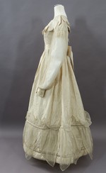 Das Mieder und die kurzen Puffärmel sind mit weißer Baumwolle gefüttert. Im rechten Rückenteil ist oben ein beschriftetes Leinenband eingenäht. Dort steht "Miss Crompton / 21 / worn by (getragen von) / Mrs. Werner".