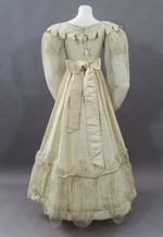 Das Kleid wird im Rücken mit Zugbändern an Ausschnitt und Taille sowie mit Haken und Ösen geschlossen. An der Kante des rechten Rückenteils sind 3 Schleifen aus weißem Taft aufgesetzt, die einen Bandverschluss vortäuschen sollen. Die rechte Ansatznaht der hinteren Rockbahn ist als Tascheneingriff auf Hüfthöhe ein Stück geöffnet.