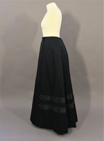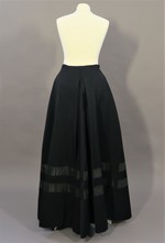 Der lange, leicht ausgestellte Rock ist aus schwarzem Garbadine und wird vorrne mit Haken, Ösen und Druckknöpfen geschlossen.