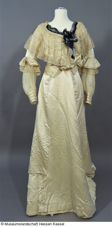 Über der Taille wird der Satin mit Haken und genähten Ösen geschlossen.