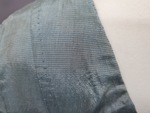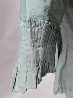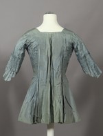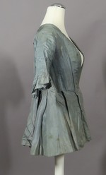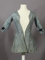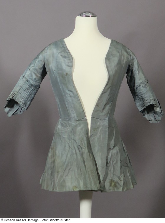 Dieser Caraco ist aus sehr fein hell- und dunkelblau gestreiftem Seidentaft hergestellt. Der dadurch entstehende Changé-Effekt war im letzten Viertel des 18. Jahrhunderts sehr beliebt. Das ist auch die Entstehungszeit des à la francaise, also mit einem eingehakten Stecker, zu tragenden Caraco mit Watteaufalte, der in dieser Form auch als Pet-en-l’air bezeichnet wurde.