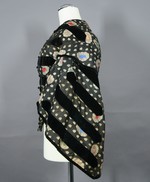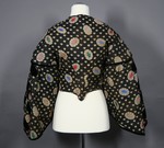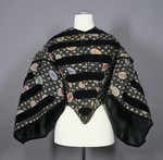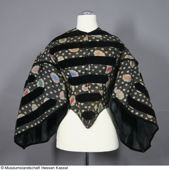 Kragenlose Damenjacke aus schwarzgrundigem, seidenem Druckstoff mit breiten Pagodenärmeln. Die Jacke wird vorne mit 11 schwarzen Posamentenknöpfen geschlossen und läuft in einer Schneppe aus.
