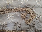 Die einfarbige Weste ist an den Vorderkanten und Taschenpatten mit Schnurapplikationen verziert, in die Knöpfe und Knopflöcher integriert sind. Geschlossen wurde die Weste ursprünglich mit runden, mit dem Westenstoff bezogenen Knöpfen. Davon ist unter den Taschenpatten jeweils ein Exemplar erhalten. Die am Vorderteil vorhandenen Knöpfe sind aus Glasfluss und stammen aus dem 20. Jahrhundert.