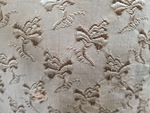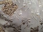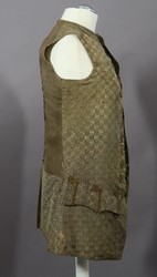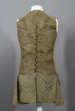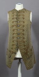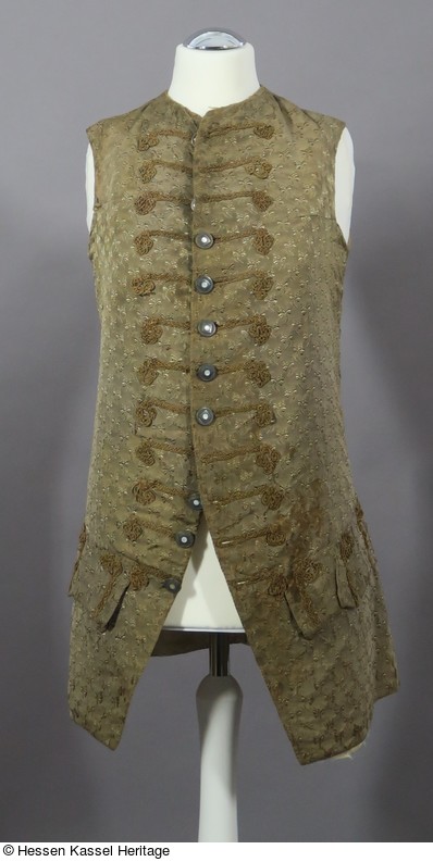 Diese Weste reicht bis an die Mitte der Oberschenkel und stammt aus der Mitte des 18. Jahrhunderts. Sie hat einen kleinen Kragen und ist aus braunem Droguet mit einem kleinen Blütenmuster. Droguet bezeichnet eine Gruppe von kleingemusterten Seidenstoffen in einer bestimmten Bindungsart, die ab Mitte des 18. Jahrhunderts besonders gerne für Herrenwesten verwendet wurden.