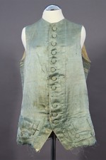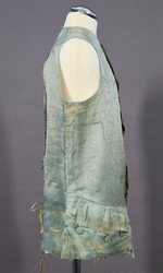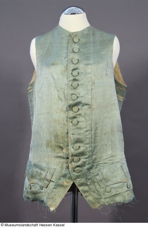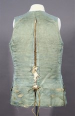 Gefüttert ist die Weste mit feinem, hellen Leinen. Das Rückenteil ist von den Schultern bis zum Saum offen (die Seitennähte sidn heute aufgetrennt), an den Schoßansätzen sind Reste von Leinenbändern erhalten, mit denen die Weite des Kleidungsstücks reguliert wreden konnte..