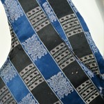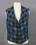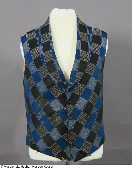 Kurze Herrenweste aus einem blau-schwarz gestreiften Atlas liseré, der im diagonalen Fadenlauf verarbeitet wurde. Die blauen Streifen tragen einen Dekor aus uni Feldern und floralen Blöcken in Weiß und Rosa im Wechsel, in den schwarzen sind es geometriche Blöcke in Weiß und Beige. Die gemusterten Blöcke in den Streifen sind so versetzt, dass optisch ein Karomuster entsteht