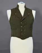 Der Westenstoff ist im Querfadenlauf verarbeitet. (auf dem Rücken ist an der Schulterpartie eine Webkante vorhanden) Der Rücken ist aus feinem, braunem Leinen, Vorderteile und Kragen sind mit einem hellen, groben Leinen gefüttert. Im Rücken sind zwei Riegel und eine Schnalle angenäht, um die Taillenweite regulieren zu können.