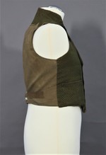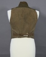 Die Weste hat einen Stehkragen und Revers. Sie wird mit 5, mit einem Blütenzweig gravierten Messingknöpfen geschlossen, die durch weitere fünf zur Doppelreihe ergänzt wird. Die Revers werden ebenfalls festgeknöpft. Die Weste läuft vorne spitz zu und hat zwei gerade Taschen.