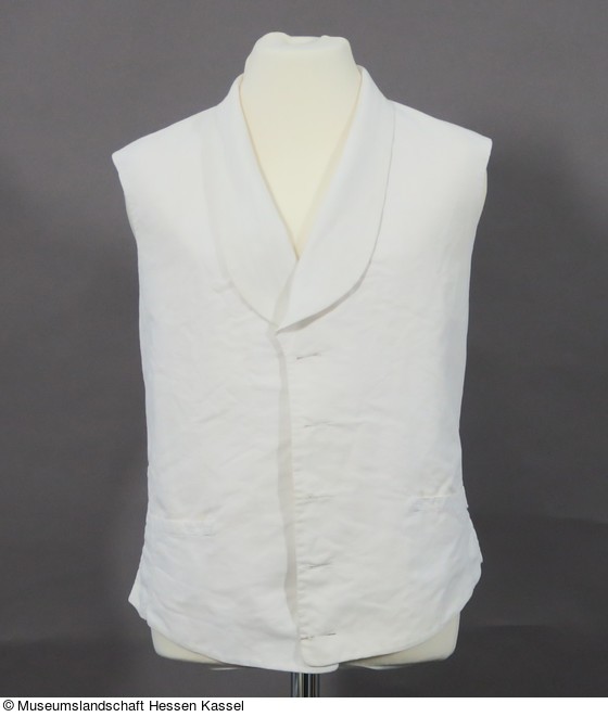Die Weste ist tailliert, vorne rund geschnitten, hat einen schmalen, vorne herabgezogenen, runden Kragen und wird mit fünf Knöpfen geschlossen. Für die Knöpfe sind genähte Ösen vorhanden, durch die Wechselknöpfe gesteckt werden konnten. An den Vorderteilen sind zwei schmale Taschen eingearbeitet.
