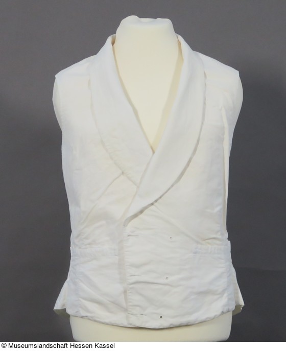 Die Weste ist tailliert, vorne rund geschnitten, hat einen schmalen, vorne herabgezogenen, runden Kragen und wird mit zwei mal drei Knöpfen doppelreihig geschlossen. Für die Knöpfe sind genähte Ösen vorhanden, durch die doppelseitig verwendbare Wechselknöpfe gesteckt werden konnten. An den Vorderteilen sind zwei schmale Taschen eingearbeitet.