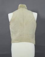 Weste mit hohem Stehkragen und Taschenpatten aus cremefarbenem, seidenem Taft. Für das Futter der Vorderteile wurde ein weißer Seidenköper verwendet, das Rückenteil ist aus hellem, groben Leinen.