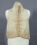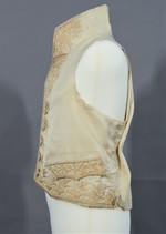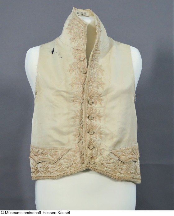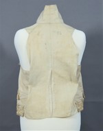 Weste mit hohem Stehkragen und Pattentaschen aus hellem Seidenköper. Für das Futter der Vorderteile wurde ein weißer Seidenköper verwendet, das Rückenteil ist aus hellem Leinen.