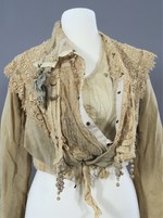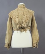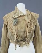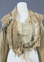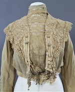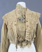 Sie ist vorne bis zur Taille geöffnet, der Ausschnitt ist mit einem Einsatz aus Tupfentüll gefüllt, der am Dekolletée in 3 Spitzenbänder auf Tüllgrund übergeht, die durch Streifen aus cremefarbenem Taft getrennt sind. Daran schließt der hohe, durch Stäbe versteifte Kragen aus einem identischen Spitzenband an. Den Abschluss bildet ein Taft- und ein grauer Chiffonstreifen, der im Nacken eine Schleife bildet.