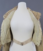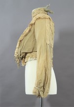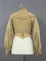 Die Bluse ist auf eine Futtertaille aus hellem Baumwollstoff gearbeitet, deren senkrechte Teilungsnähte mit Fischbein versteift sind und die mit einem Taillengurt ausgestattet ist.
