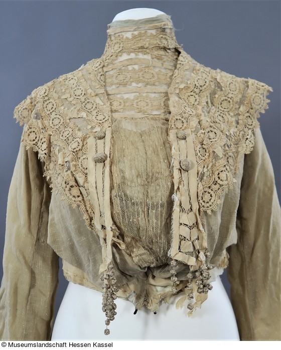 Über den Schultern der Bluse liegt ein breiter Kragen aus Spitzenbändern aus Tupfentüll, der im Rücken rund fällt und auf der Vorderseite zu den Kanten hin spitz zuläuft. Dort sind 2 Besätze aus cremefarbenen Taftbändern aufgesetzt, die in lanzettförmigen Spitzen enden. Sie sind mit Schnüren aus Posamentenkugeln besetzt und hängen lose herab.